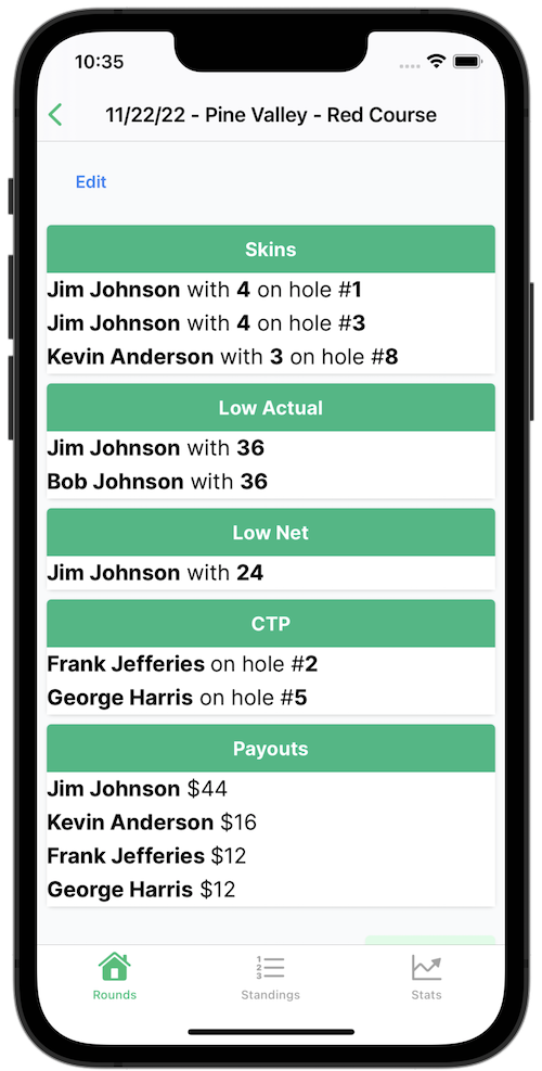 Enjoy a beer after your round instead of figuring out who won skins. Everyone will know as soon as the round is done. We'll also tell you how much cash each winner gets.